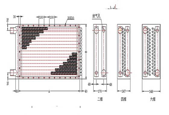 1.GLⅡ工業散熱器為鋼製雙回路(二排)、或多回路(四排、六排)結構,散熱管用Ф18*2mm無縫鋼管,經專機繞片10*0.3mm皺折鋼帶而成,呈螺旋狀,其片距為3.2mm,承壓高,耐腐蝕;2.GLⅡ工業散熱器的散熱排管全叉排排列,並個單獨彎頭管連接; 3.GLⅡ工業散熱器的散熱管特性: